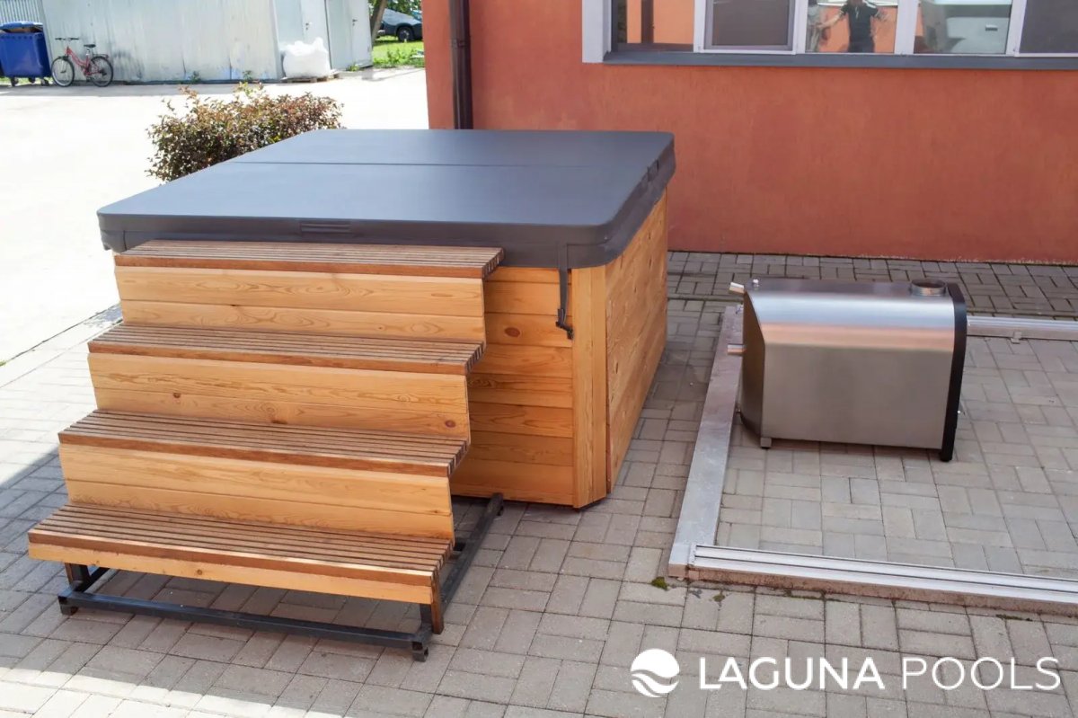 Гидромассажная ванна с деревянной отделкой размещена на мощеной плиткой площадке с лестницей и защитным чехлом.