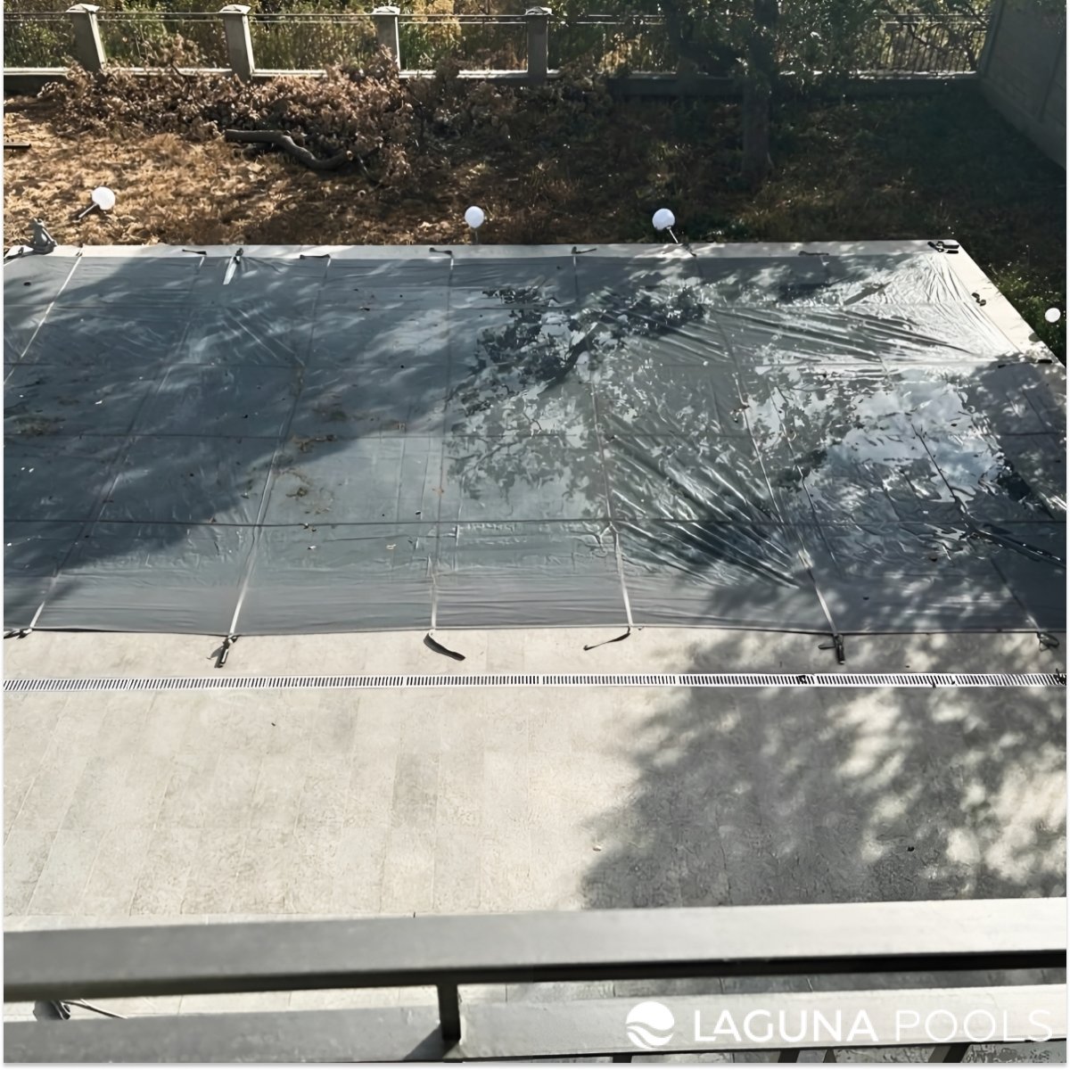 Прямоугольный бассейн накрыт темным защитным тентом, закрепленным на бетонной площадке с окружающей растительностью и забором.